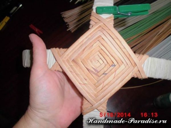 Теперь соединяем обе наши заготовки, оплетенные полоски из картона, и начинаем их оплетать по фотографиям ниже.