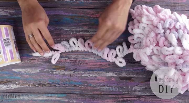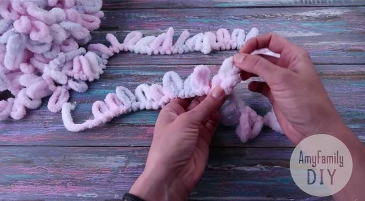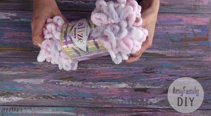 Все, что нужно, пряжа из микрополиэстра (на одеяло 1х1 метра потребуется 5 клубков). Она состоит из уже готовых петель, поэтому дополнительные инструменты не нужны.