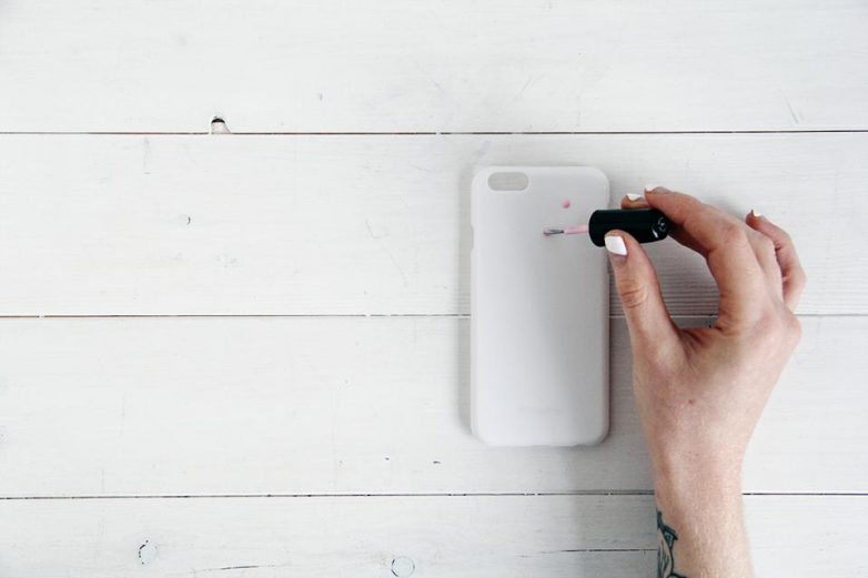 Мокните кисть в лак для ногтей и аккуратно накапайте небольшие точки на корпусе чехла.