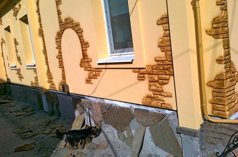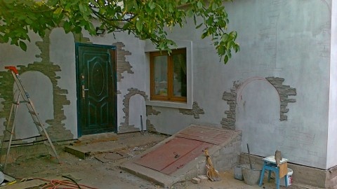 Для лепки смешиваем строительную смесь СМ-11 и СМ-8 в равных пропорциях. контур рисунка пробиваем мелкими сапожными гвоздями(чтобы хорошо держалось)...«рисуем» кирпичики… когда просохнет-зашкуриваем, чтобы сгладить шероховатости…
