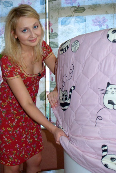 8. Теперь осталось только одеть на кресло чехол на основе синтепона, который сделает предмет еще более мягким. Выбираем стеганую ткань с веселым кошачьим рисунком – идеальный вариант для дачи или детской.