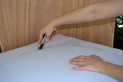 7. Накинем тонкий поролон на спинку, закрепим его степлером и отрежем все излишки.