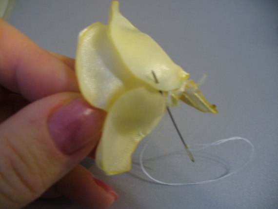 Если лепесточки нужно прижать к бутончику, то аккуратненько, чуть выше мы его прихватываем ниткой.