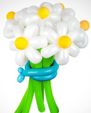 Также можно использовать шары в форме сердца. Верхняя часть будет состоять из «четверки» шаров 5-ти дюймового диаметра и серединки такого же размера. Очень хорошо смотрится, когда сердцевидные шары и середина – белого цвета, а верхняя часть лепестков – голубого или розового цвета.Если применить чуточку фантазии, то такие композиции и красивые гирлянды из цветов отлично украсят интерьер к празднику.Ромашка из воздушных шаров своими рукамиДля изготовления ромашки Вам понадобится 2 шарика для моделирования (ШДМ) белого и зеленого цвета, а также насос для воздушных шаров.
