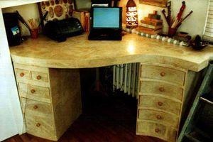 Склоняюсь к тому, что выравнивание шло обычной бумагой-крафт, потом сверху выкрашивали краской в несколько слоев, шлифовали, чтобы избавиться от стыков (да, все стыки на картона должны быть обклеены бумажным скотчем). Внешние крышки ящиков и столешница отделаны материалом «под кожу». Такой можно достать в магазинах рукоделия для переплета книг) и в строительно-обойных отделах должно быть что-то похожее. Сверху наверное темный лак.