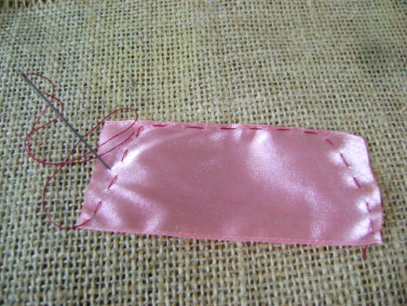 Итак, приступим. Нам нужна широкая лента. Отрезаем кусочек и обжигаем края зажигалкой. Затем простегиваем его так: