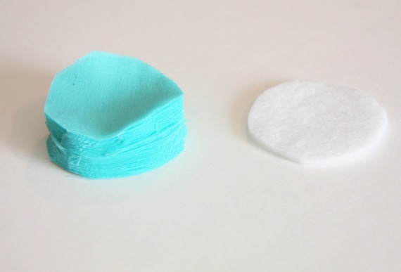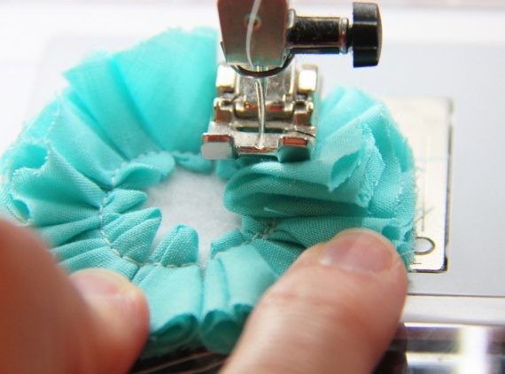 Полученные ситцевые бирюзовые кружки будем пришивать на швейной машинке к основе, предварительно сложим сначала напополам.