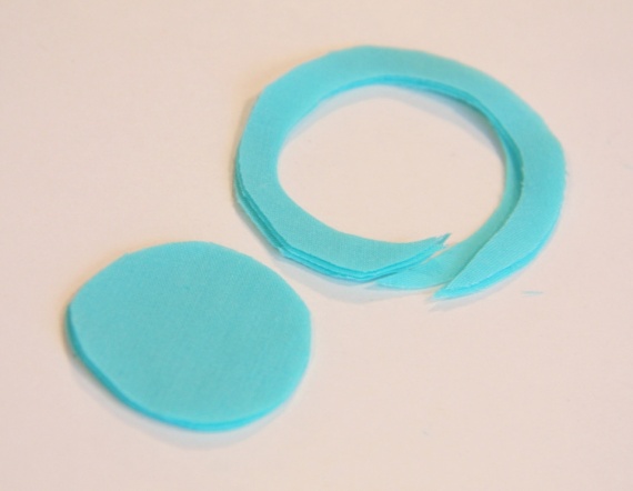 Нам понадобится сатиновая или хлопковая ткань яркого цвета (в нашем случае бирюзового). Полоска ткани шириной 7-9 см длиной 200-250 см. Сложите ее гармошкой и вырежьте из ткани кружки. Края необязательно должны быть ровными. Если сложенная ткань получилась толстой и ножницы ее не берут, то разделите полоску ткани на две части.