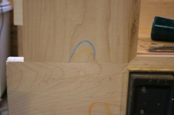 В пазах и брусках обвязки есть слегка изгибающиеся детали. Я начинаю делать этот изгиб, выпиливая выемку под малым углом на станке. Затем я зашлифую выемку при помощи рубанка и наждачной бумаги.