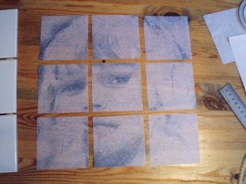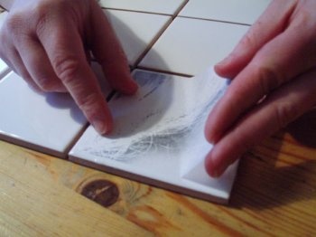 Смазываем плитки клеем для декупажа. Поверх прикрепляем папиросную бумагу с картинками.