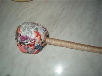Теперь приступим к изготовлению кроны нашего дерева из кофейных зерен. Для этого нам понадобится пенопластовая заготовка выбранной вами формы: самая простая — шар (или несколько), хотя можно и сердечко, если вы готовите подарок любимому человеку. Также можно изготовить заготовку из пластикового шара, либо газет обвязанных ниткой, которым придается шарообразная форма. Прикрепляем нашу крону к стволу.