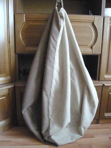 Внешний чехол изготавливается из износостойкой декоративной ткани (2,5м х 1,4м) – вельвет, джинсовая ткань, кожа, кожзам, холст, обивочная ткань и т.д. Если используете ткань не пропускающую воздух тогда необходимо в верхней части кресла сделать технологические отверстия для выхода воздуха используя люверсы.