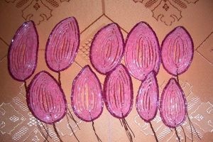 3 лепестка, в основании которых десять бисеринок и пять дуг;3 лепестка, имеющие в основании двенадцать бисеринок и шесть дуг;5-8 лепестков, в основании которых 14 бисеринок и семь дуг.