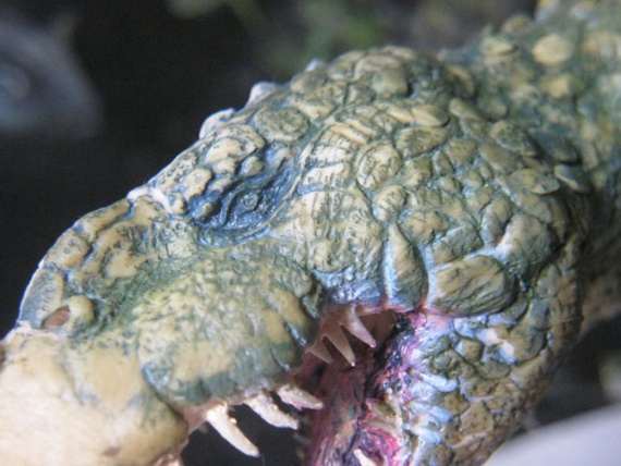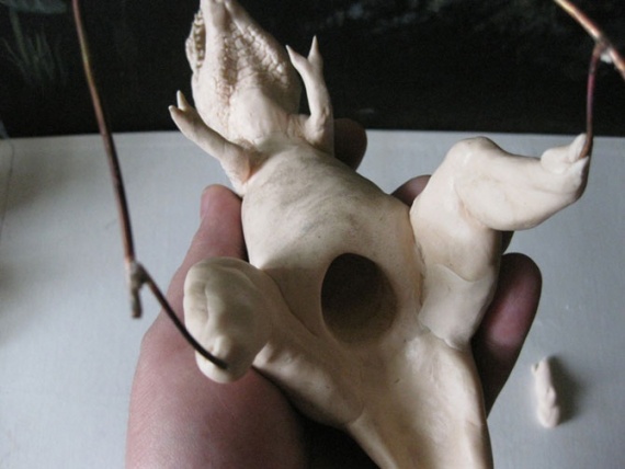 Потихоньку вырисовывается. Появились роговые отростки, шкура приобретает текстуру. От лепки пластмасса очень пачкается, за чистотой уследить сложно. Где-то на этом этапе я додумался использовать тальк. Очень помогает изделию не липнуть к рукам.