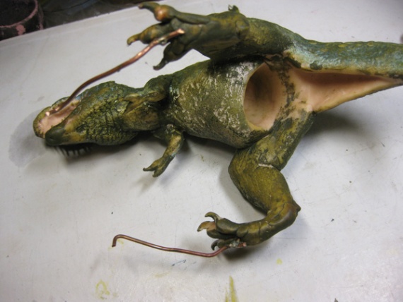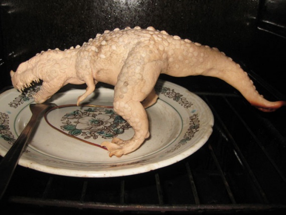 И вот зверюшка готова к запеканию. Вроде все в порядке, кроме ступней. Было принято решение довести их до ума после окончательного окоченения (сломай язык, чего уж) режуще-пилящими инструментами. Тут ти-рекс еще вялый, и поэтому любой может взять его на руки, слепить из него «снежок», например, и запулить им с балкона по лысой башке… Но мы пойдем дальше.