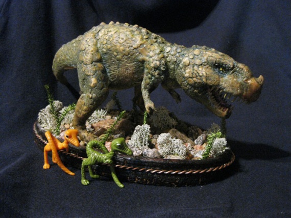 Текстурирование шкуры началось: оформлен взгляд, роговые панцирные наслоения на коже, шрамы, как ордена, и все они от старших товарищей… Хотя, скорее всего, не только. Добыча в то время была опасная. Не колбаса копченая, еще попробуй завали! Детали выминаются тонкой металлической палочкой.