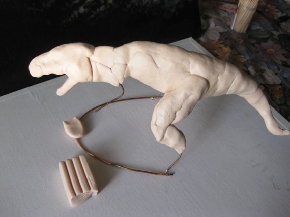 Начинается все со скелета. Зверь должен жить долго, поэтому подход к задаче основательный. Допущенные ошибки подпортили дальнейшую работу с изделием: крепление скелета к основе оказалось хреновым. Двух точек недостаточно, ибо фигура при обработке кивает, как болванчик.