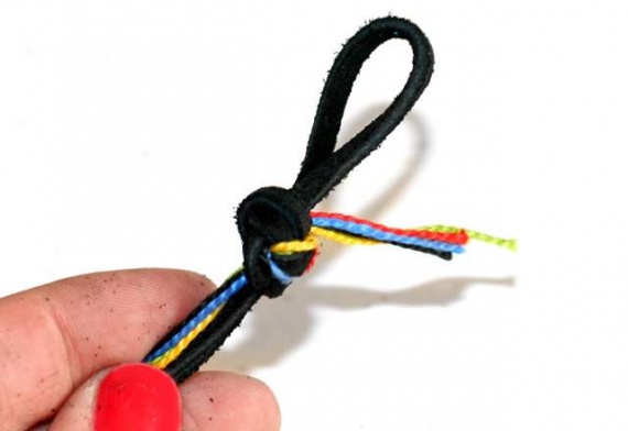 Начинаем обматывать кожаный шнур чередуя цвета (смотрим фото ниже).