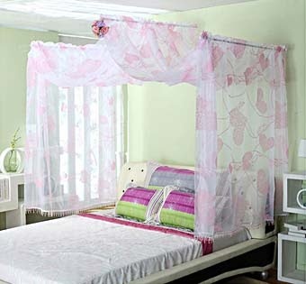 Балдахины для спальни могут быть нескольких типов. Например, этот легкий балдахин собран на легком пластиковом обруче и подвешен на крючок, установленный в потолоке над кроватью.