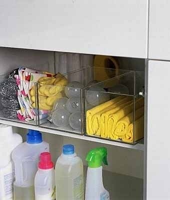 Собранные вместе чистящие средства помогут не тратить время на их поиск. Полочка в нише – отличная идея для хранения мочалок, тряпок, резиновых перчаток, порошков и чистящих жидкостей. Главное требование к их хранению – отсутствие влаги.