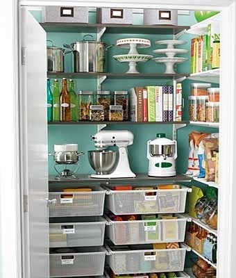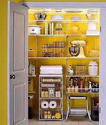 Кладовка может стать отличной гардеробной для кухонной утвари. На имеющихся полках расставляем кастрюли, электрические приборы, бутылочки и пакетики. Практично и удобно.