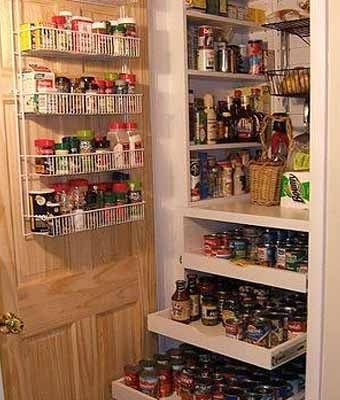 Дверь с внутренней стороны кладовки может выполнять не только функциональную роль – открыть-закрыть. Разместив на ней полочку, мы сможем создать дополнительное место для хранения продуктов.