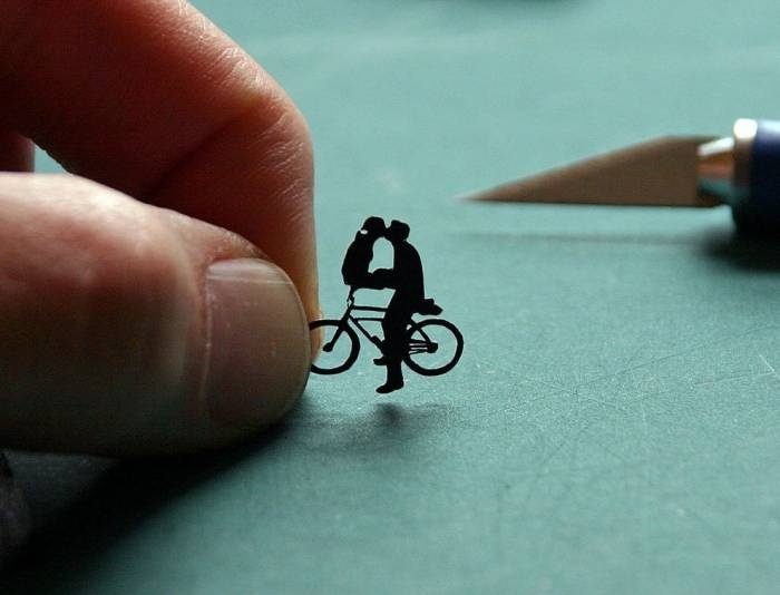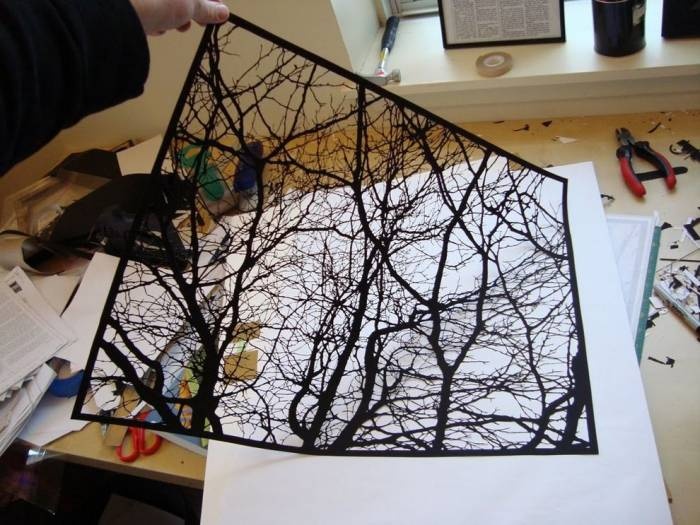 Все что надо ему для работы это — черная бумага, скальпель и остро заточенные ножницы.