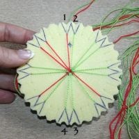 Станок для кумихимо, марудай, которым пользовались японцы в средневековье, был большим и деревянным. Сейчас любители плетения шнуров пользуются маленькими круглыми приспособлениями диаметром в 10 см из пластика или плотного картона. Его легко можно сделать самим. Вырезав круг, в его центре сделайте отверстие диаметром 1 см, а по краям – 32 насечки с закруглениями для того, чтобы нитки лучше попадали туда. Не забудьте также наметить ручкой 16 секторов на марудае и ромбик, обозначающий старт. Достаточно удобно при плетении кумихимо использовать картонные катушки, чтобы нити не спутывались. Кроме того, понадобятся нитки, например, ирис, двух цветов, у нас это зеленый и красный.