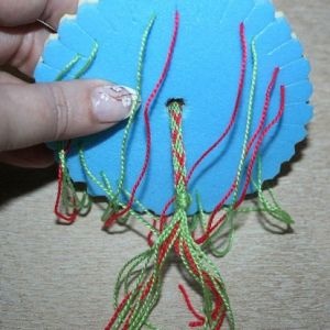 Нарезаем 16 нитей длиной 50 см, из которых 5 должны быть красными, остальные – зелеными. Необходимую длину ниток определяем следующим образом: отмерив окружность, скажем, запястья, прибавляем 6 см (это длина шнурка) и умножаем на 2 – получается длина нитей, которую нужно отрезать.Продеваем их края в центральное отверстие станка, завязываем в узелок, и, подтянув нитки спереди, начинаем раскладывать по насечкам согласно цветовой схеме. Свободные концы нитей нужно нанизать на катушки.