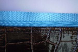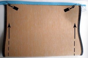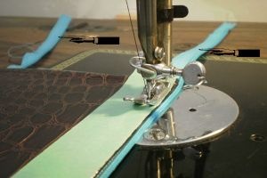 Самый важный момент — сделать «правильную» строчку. Если материал имеет лаковое покрытие, то проложить ее будет сложно, так как лапка машинки не будет скользить по поверхности. Для этого используем бумажный скотч или лист бумаги. Предварительно подгибаем края по бокам.Если вы хотите прикрепить свой ярлычок, то делать это необходимо в начале работы во время подгибки краев.