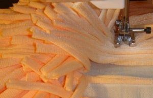 Вытягиваем полоски, чтобы их края закручивались. Разрезаем полоски на отрезки длиной около 10 см. Приготовленные полосы пришиваем на основу так, чтобы линия шва проходила по центру полоски. Ряды располагаем на расстоянии 2 – 2,5 см друг от друга.