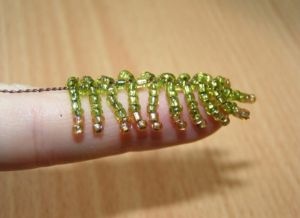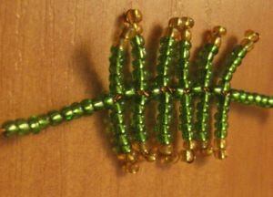 На проволоку набираем 7 зеленых и 2 медовых бисеринок, оставляем одну и продеваем обратно проволоку через 8 бисеринок, получаем иголочку – верхушку листика.
