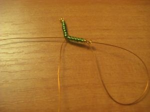Скручиваем проволоку два-три раза и вдеваем 1 зеленую бисеринку.