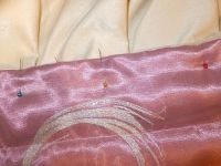 С помощью скотча стежку прочно крепим к полу, избегая перекосов. На него укладываем синтепон, атлас и органзу. Расправляем поверхность ребром линейки, чтобы ни на одном слое материала не было складочек.