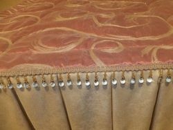 Выкладываем складочки, закрепляя их булавками к изнанке покрывала. Пристрачиваем так, чтобы все углы оборок сходились. Оборку проглаживаем утюгом и делаем строчку по верхней ткани. По этой строчке можно пустить декоративную ленту или стеклярус. Наше стеганое покрывало готово!