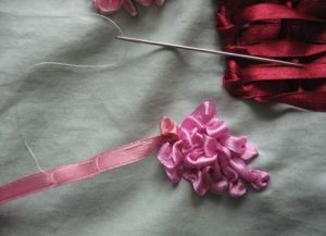 Потянув на нитку, стягиваем ленту в сборку – у нас получается симпатичный объемный цветочек сирени. Иголку с ниткой следует вывести на изнаночную сторону и сделать узелок для закрепления нити.