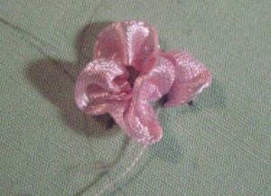 Теперь снова необходимо вывести на лицевую сторону ткани и снова сделать на ленте стежки в той же последовательности, что и ранее. Кстати, закрепление нити на изнанке нужно повторять после вышивания каждого цветочка.