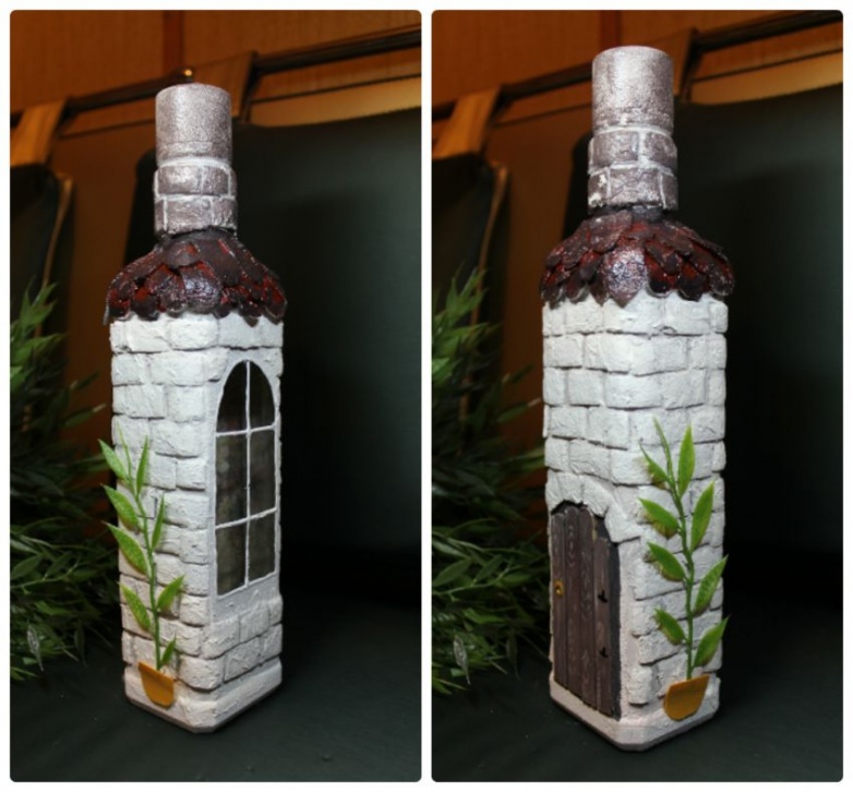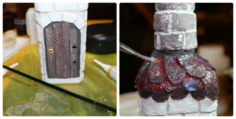 Обклеиваем «кирпичами» всю бутылку. Вырезаем «черепицу».