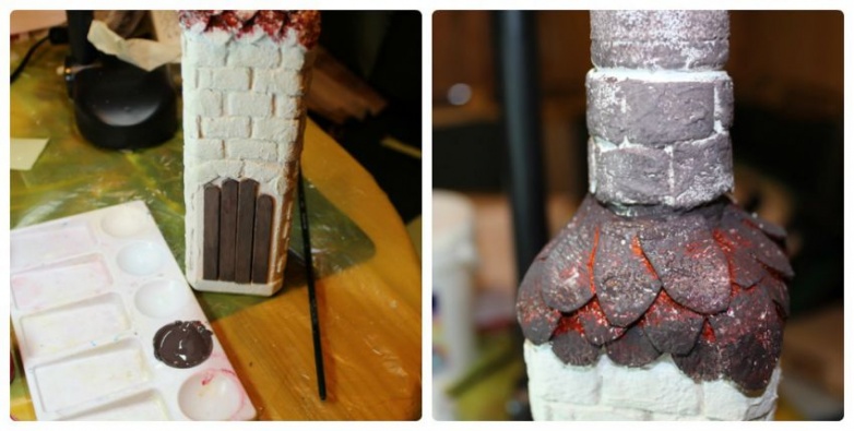 Красим все труднодоступные места «крыши» в смесь черного с красным (этот цвет будет проступать сквозь основной коричневый).