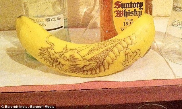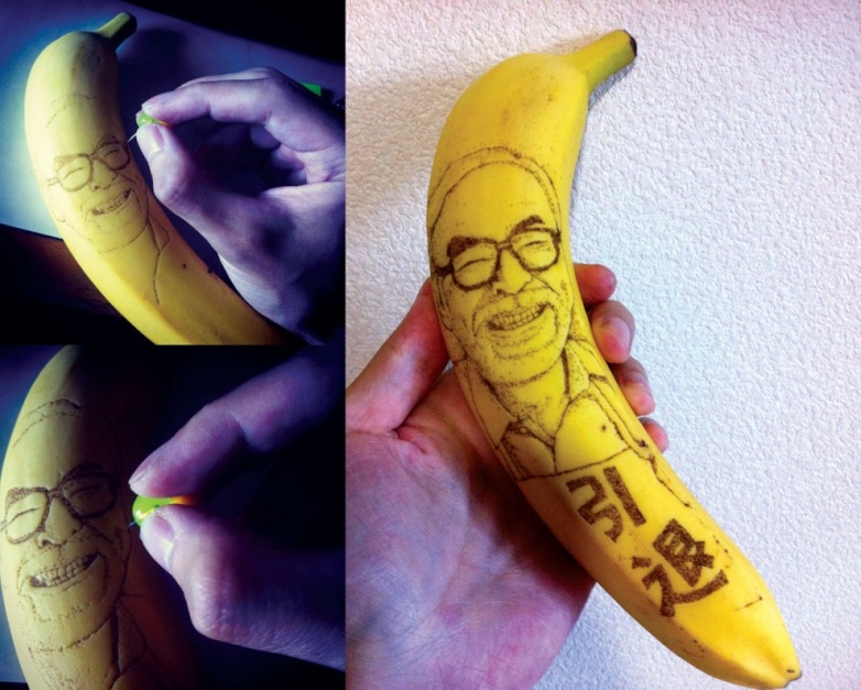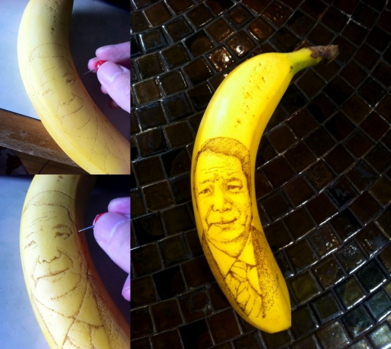 Художник Дайсуке Скагами из Токио создает из бананов настоящие произведения искусства, пользуясь тем, что то место, в котором пронзается кожура, обязательно чернеет.