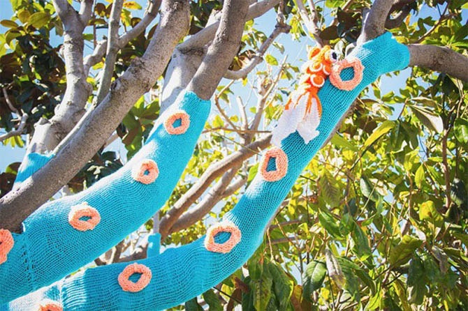 Именно так могли бы сказать жители города Сан-Матео (Калифорния), если бы были знакомы с творчеством Корнея Чуковского. А дерево у них и в самом деле необычное. Причём ещё совсем недавно цветущая магнолия ничем не отличалась от остальных, пока сёстры-дизайнеры Джилл и Лорна Уотт не решила принарядить её в вязаные одежды. В результате получилось ярко-голубое дерево, привлекающее взгляды прохожих.