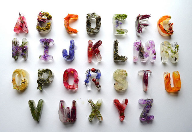 Петра Благова представила все буквы алфавита от А до Я, точнее от A до Z. Всего 26 ледяных заглавных литер, которые, судя по всему, достаточно тяжело было уберечь от таяния в процессе фотографирования. Изюминка проекта в том, что вместе с водой дизайнер заморозила зелень папоротника, лепестки цветов и ягоды, что делает фигурные льдинки свежими, яркими и сочными.
