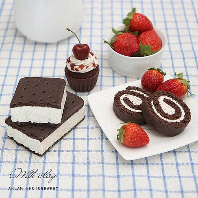 Алам создает крошечные копии всяких вкусностей – шоколадок, драже, пирожных и других сладостей. Всё это выглядит настолько аппетитно, что даже слюнки текут.