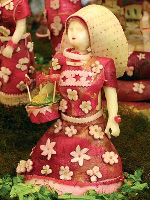 Для создания фигурок фермеры используют овощи, вес которых может достигать трех килограммов, а длина — 50 сантиметров. Из такой редиски вырезают все подряд: это могут быть животные, святые, ангелы, предки современных жителей Оахаки, запечатленные в танцах или в трудах на полях со злаками и овощами. В общем, сюжет может быть абсолютно любой — главное, чтобы фигурки были сделаны аккуратно и крепко держались на ногах (для этого их часто закрепляют с помощью палочек).