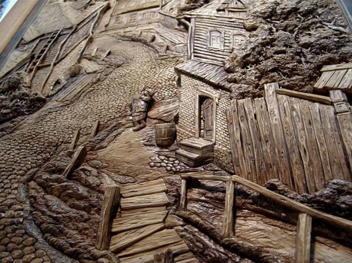 Из-под резца художника появляются картины, панно и предметы интерьера.