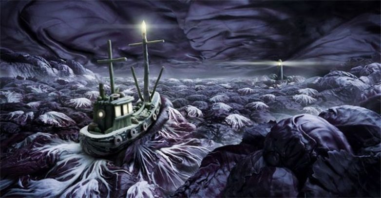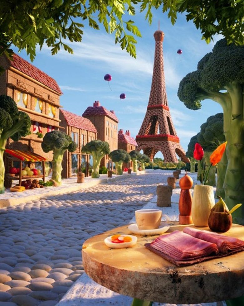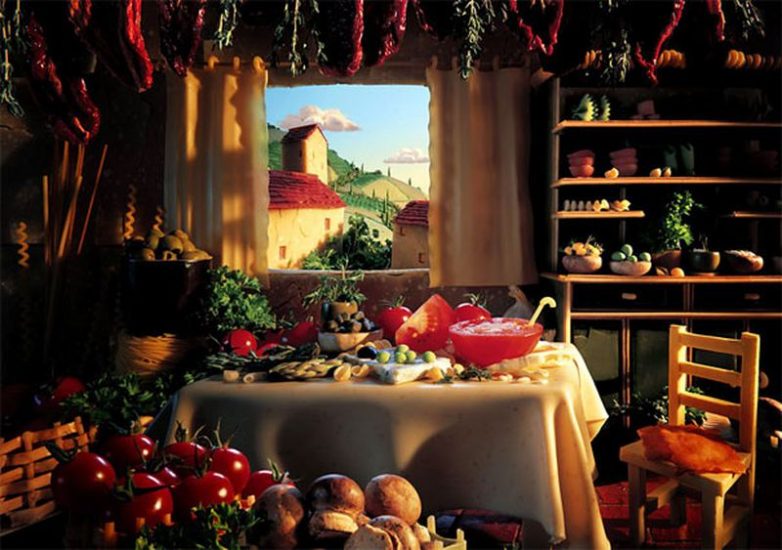 Все дело в том, что Карл Уорнер, иллюстратор по образования, мастер жанра с его подачи известного как «Foodscapes», то есть пейзажи из еды. На его картинах горы сделаны из хлеба, деревья – это брокколи, волны — листы капусты, а роль камней исполняет печеный картофель.