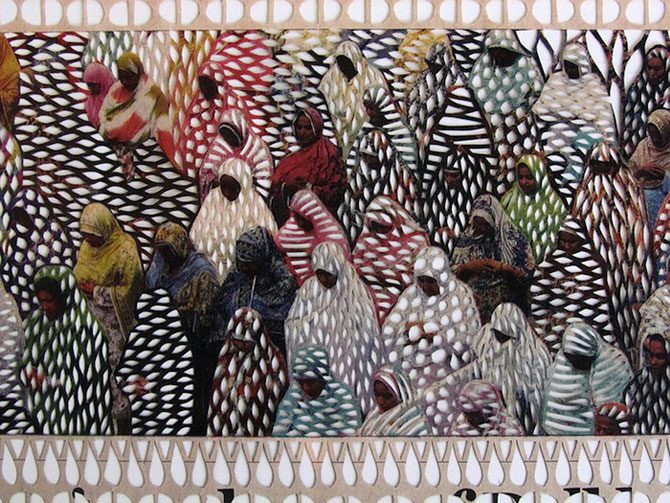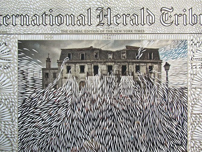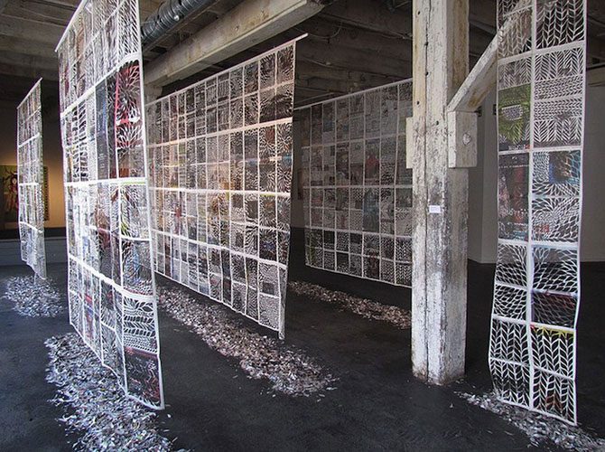 Мириам Дион – студентка кафедры изобразительного искусства и информационного дизайна Университета Квебека. Работая со старыми выпусками газет «Financial Times», «The International Herald Tribune» и «Le Devoir», она вырезает из бумаги затейливые, напоминающие старинное кружево, узоры. Скреплённые в полотна, способные покрыть целую стену, страницы газет становятся похожи на образцы сложного дизайнерского текстиля.