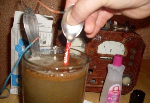 Берем автомобильное зарядное или зарядку от телефона цепляем (+) на изделие, а (-) на любую металлическую вещь помещенную в сосуд.