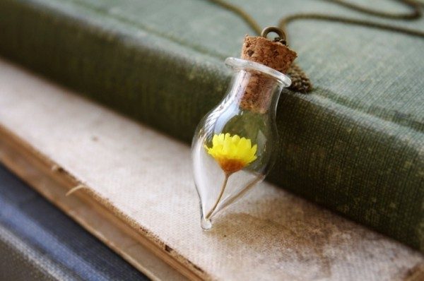 Сделанные её руками аксессуары это необычные кольца и подвески в виде маленьких бутылочек с очаровательными лесными пейзажами внутри.