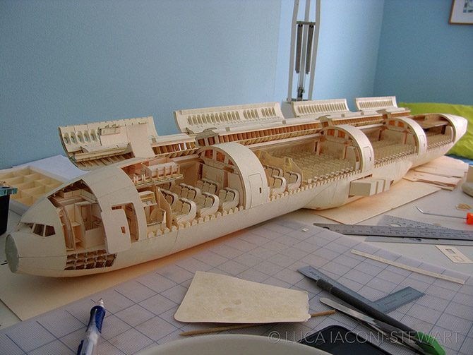 Однажды Лука Иакони-Стюарт, ученик старших классов, получил задание на уроке архитектуры. Ему нужно было сделать простые модели самолетов из бумаги, но эта идея так вдохновила его, что он решил сделать нечто более амбициозное. Он всегда интересовался самолетами, поэтому решил сделать из бумаги точную модель Боинга 777 в масштабе 1:60. Так он начал строить модель еще в школе, на проект ушло много бумаги и пять лет жизни, но он еще не завершен. Лука надеется закончить его летом, чтобы начать другой — есть идея создать новую, более крупную модель самолета.